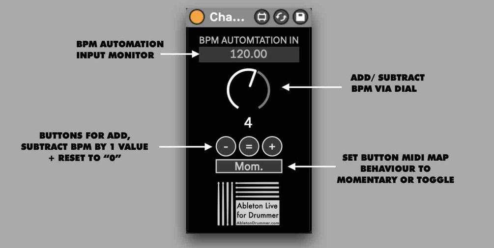 You will need to copy the tempo automation you set to the "BPM AUTOMATION IN" of this device. You can then add and subtract the BPM by steps of 1 or you can use the rotary knob to change the BPM 30 values up or down.