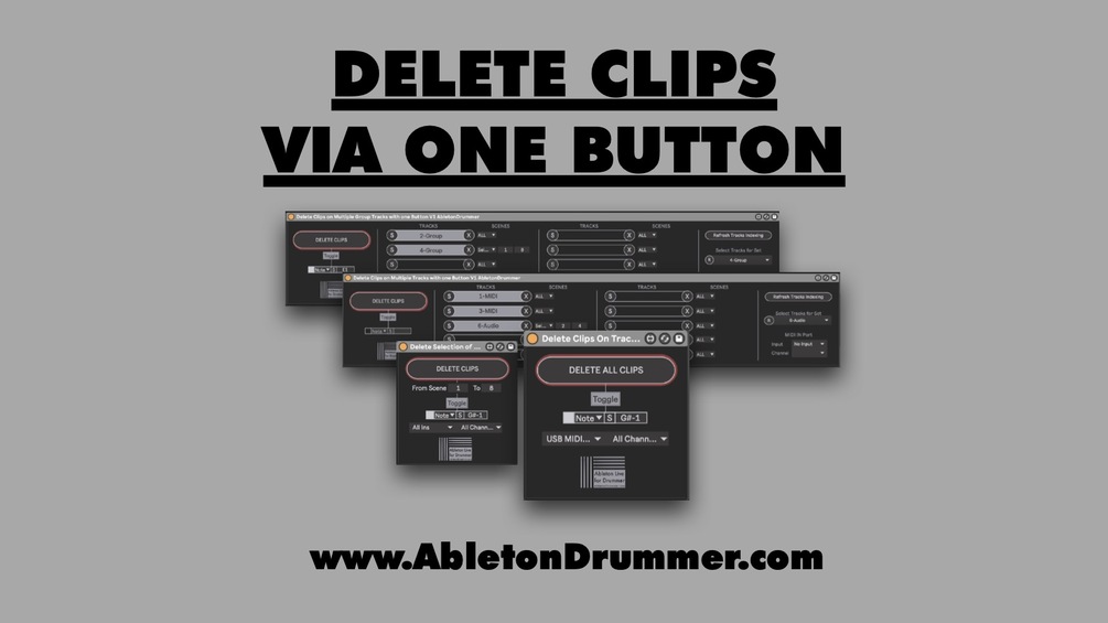 This pack of 4 Max for Live devices lets you delete clips on single or multiple tracks in Ableton Live Session View e.g. via a button from your MIDI controller quick and easy.