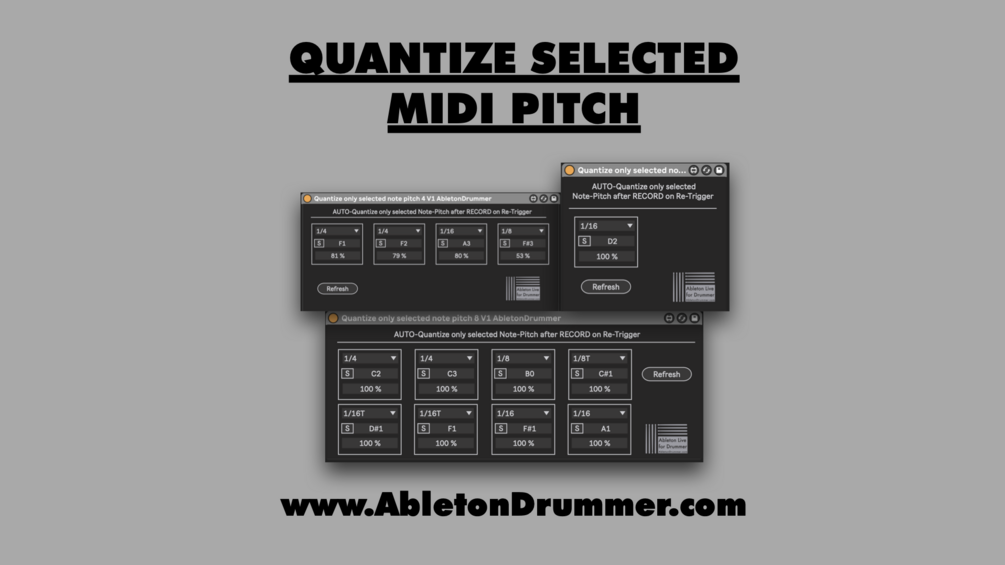 This Max for Live pack consists of 3 devices for automatic quantisation for selected MIDI pitches to individual settings when recording MIDI in Ableton Live's Session View. This means you can have different settings for different MIDI notes you record live and have them quantised to the values and intensity it makes sense.